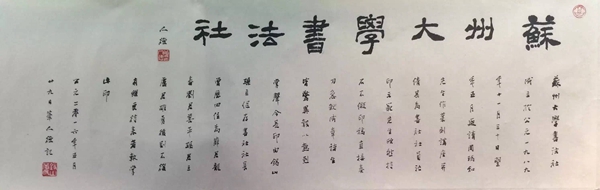 我校东吴书画院院长、学生书法社指导老师华人德先生为展览特别题字“苏州大学书法社”,以喻书法一脉代代相传,薪火不息。