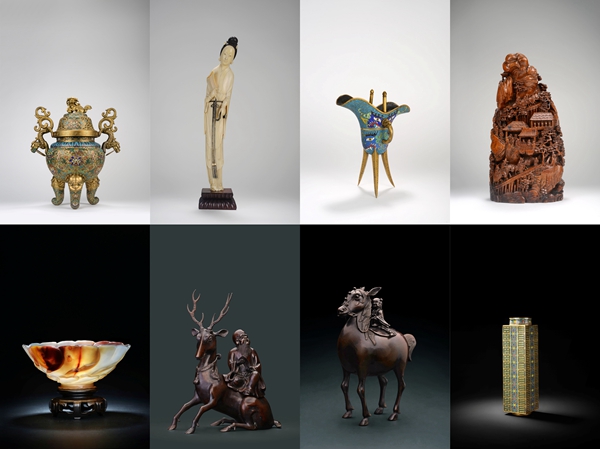 一件件沉静稳重的金属器、清新隽永的竹木牙角雕、流光溢彩的玛瑙玉雕等集中展示了士人追求的生活方式与明清时期辉煌的艺术成就。如明一品清廉香薰,用“莲”喻“廉”,用一茎出水的莲花喻官等“一品”,体现了崇尚高官廉节之风骨;如清乾隆掐丝珐琅八卦琮式瓶,沿袭远古玉琮的形制,圆口方腹代表着天圆地方,瓶身纹饰以掐丝珐琅工艺制成,色彩缤纷绚丽,装饰富丽华贵,令人叹为观止;如清康熙竹雕溪山行旅山子,因形取势,因竹造势,楼阁桥梁俨然,人物行走其间,景物极为丰富;如清象牙执扇仕女,截取整段象牙,雕就此仕女摆件,仕女发髻高盘,神态雍容,衣褶飘逸有致,将其优雅、华贵之态体现无遗;如清“乾隆御用”款莲瓣纹盏杯,用料上乘,雕工考究,整个杯盏华丽端庄,尽显皇家典范。