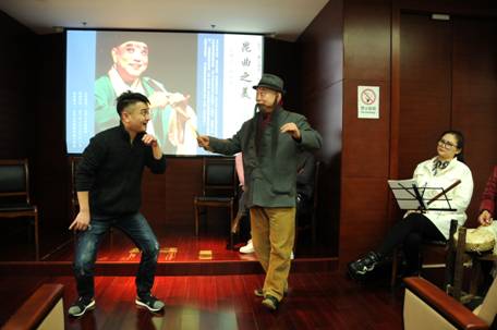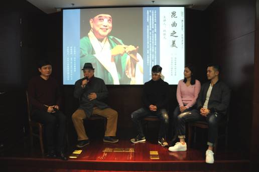 林继凡先生首先从昆曲的起源娓娓道来,他讲到昆曲是中国最古老的剧种,至今已经有600多年历史,糅合了多种表演形式,被誉为“百戏之祖”。随后,林继凡先生简单介绍了“生旦净末丑”五大行当,重点讲演了生、旦、丑三大行当及其中的小行即“家门”的特点,边讲解边请他的弟子作示范表演,从唱、唸、做、舞的程式美感与行当角色的特色美感这两个层面一一道来,为现场的听众们剖析了昆曲之美。