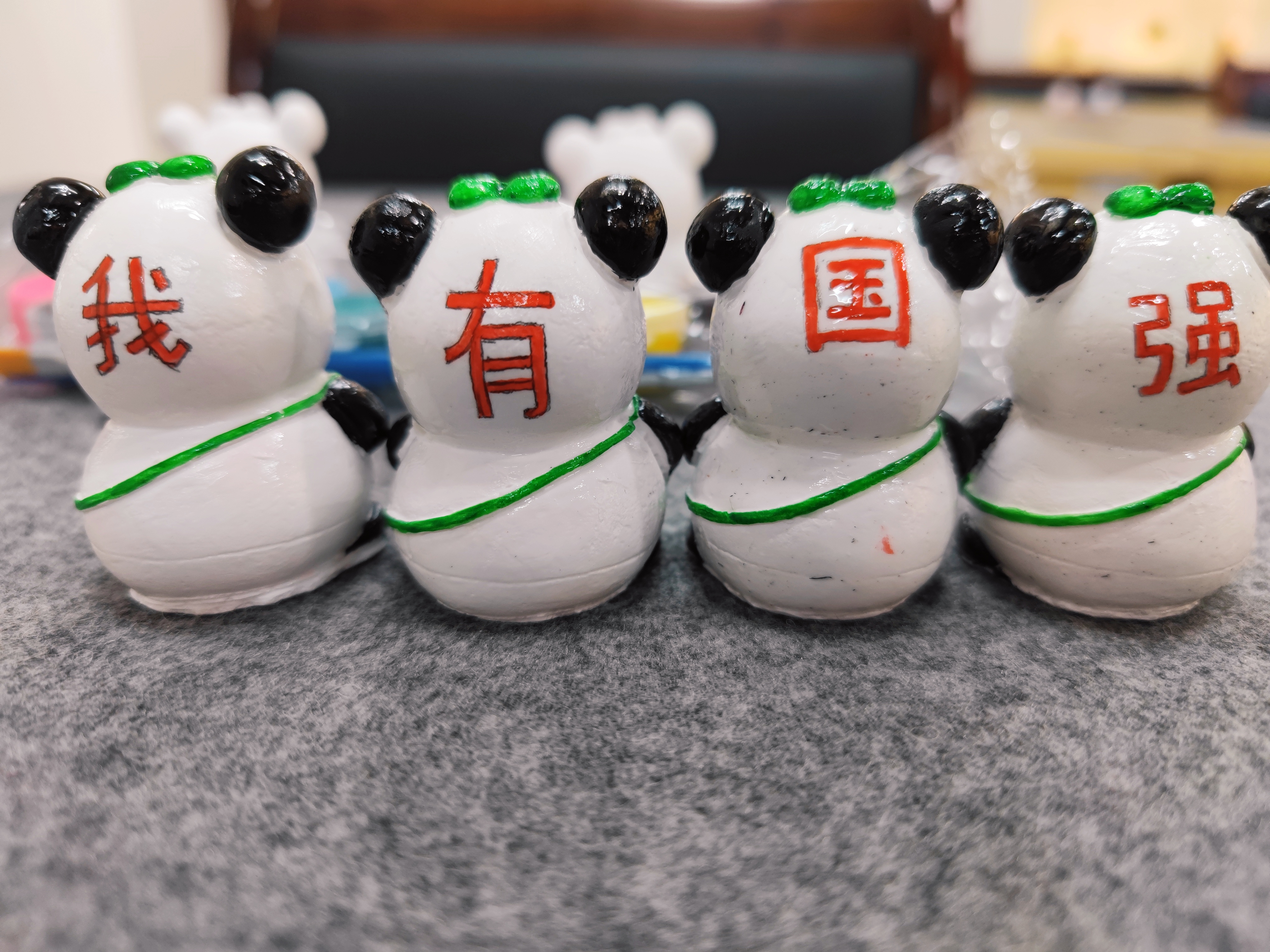 最为亮眼的是四位同学联合创作了四只憨态可掬的国宝“熊猫娃娃”,在娃娃肩背上分别勾勒出醒目的“强”“国”“有”“我”四个大字,美妙的答卷作品在流淌的色彩中寄寓着不一样的大情怀,传递出铿锵有力的时代强音。