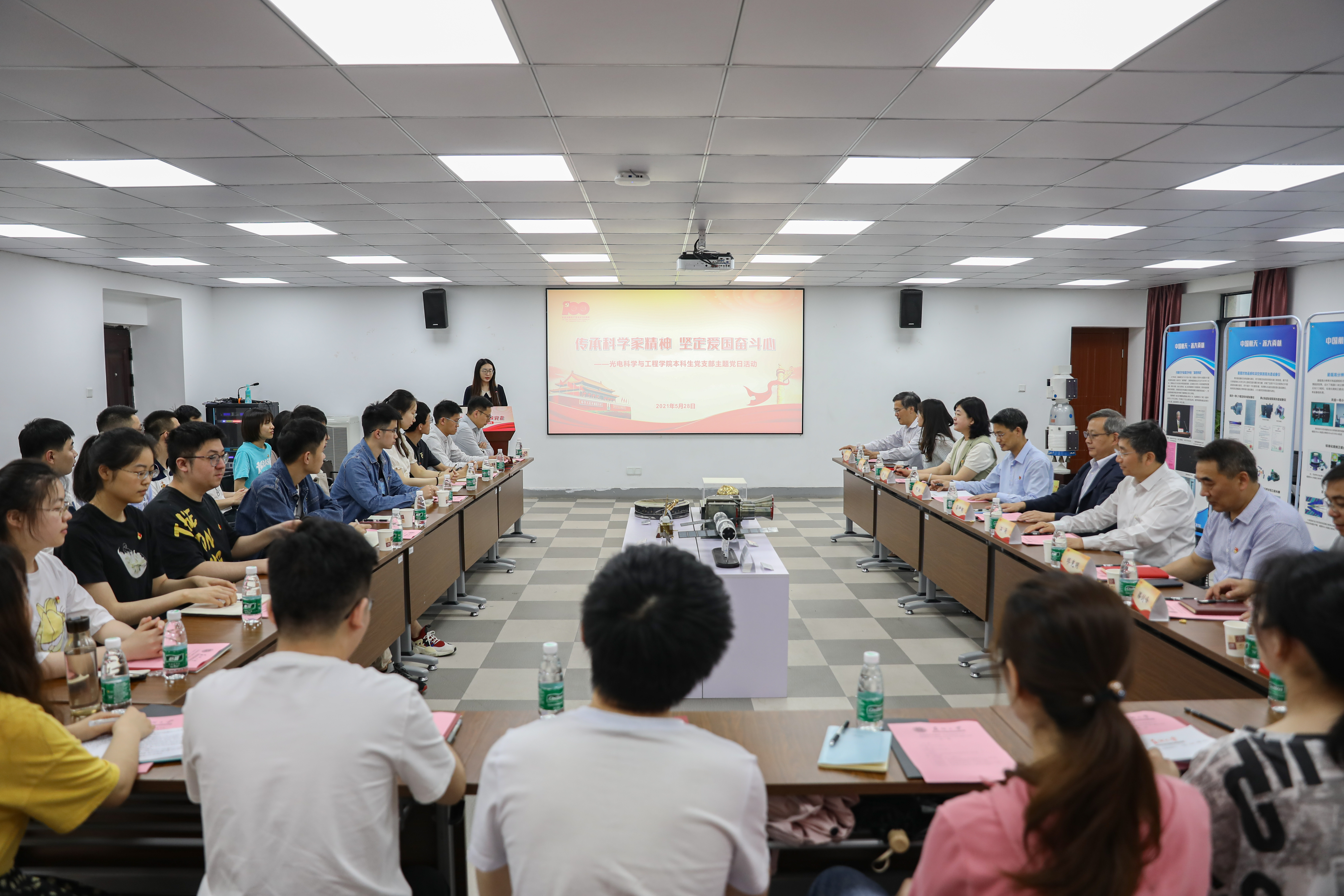 指导组来到光电科学与工程学院,列席了本科生党支部“传承科学家精神 坚定爱国奋斗心”主题党日活动,主题党日由本科生党支部书记姚亦洁主持。第一议题由黄冠平带领大家学习习近平总书记致电祝贺“天问一号”成功着陆火星的重要讲话,他围绕“青年”“创新”“复兴”三个关键词,分享了他的学习体会。他指出,认真学习习近平总书记重要讲话精神,就是要深刻领悟当代青年学生的使命担当,我们要传承前辈精神,勇于攻坚克难,用创新和自主科技解答难解之题,肩负起实现中华民族伟大复兴的使命担当。