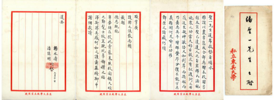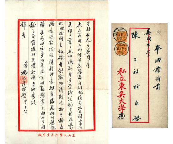 此外,还有杨永清校长与东吴大学教务长潘慎明联名表彰潘利达捐赠东吴大学图书馆全套图书《丛书集成》的书札手迹。