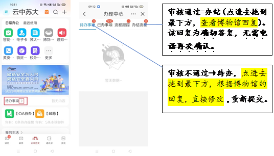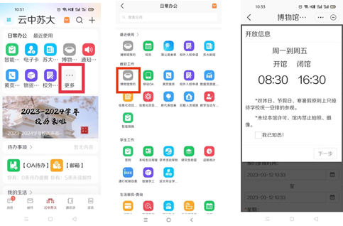 1. 预约:“云中苏大” APP——日常办公(点击“更多”)——教职工作——博物馆预约——提交。