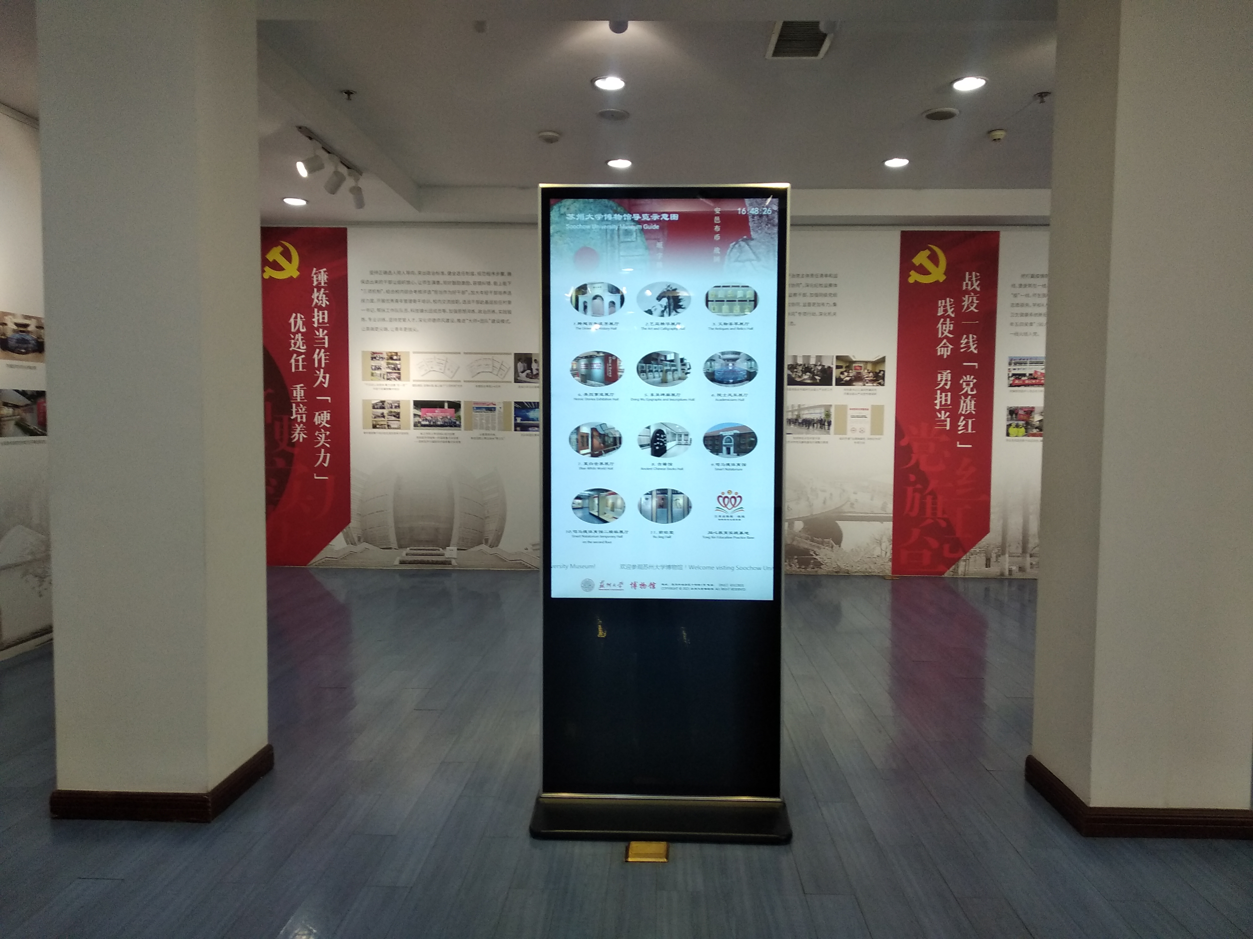 在临展厅与过厅配置了2台高清触摸一体机,展示内容包括同心教育实践基地的人物介绍与11个展厅的藏品图示和视频导览。通过数字技术将文物和展品与观众直接见面,触摸一体机让展陈“活起来”,让观众获得便捷式沉浸体验。