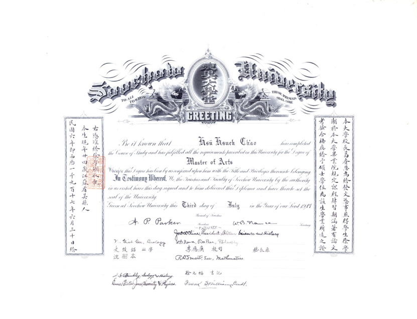 我校博物馆馆藏有中国高校存世最早的硕士学位证书,授予于民国六年(1917年)六月三十日。两张证书作对比,一个明显的不同就是学校的名称由“东吴大学堂”改成了“东吴大学”,体现了中国近代高等教育的发展史。