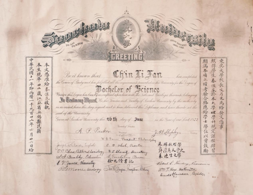 摊开证书,百年光阴仿佛就在眼前。纸页虽泛黄,字迹却清晰有力,学位证书右侧中文是:“东吴大学校长文乃史为给发文凭事照得学生秦俪范于本大学理学科规定课程肄习期满各项成绩考验合格应给学士学位以资鼓励。”学位证书左侧中文是:“本文凭准给秦俪范收执 本生现年廿二岁 江苏省立无锡县民籍 中华民国十一年即西历一千九百廿二年六月廿六日给。”