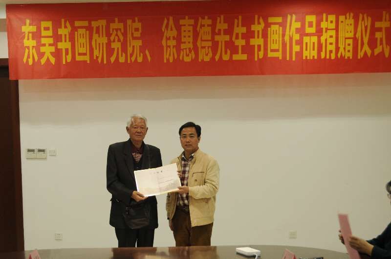 华人德先生代表东吴书画研究院(书画协会)向校博物馆捐赠书画作品共计255件,包括32件书画精品、44件书画轴和179件书画协会代表作品。书画精品中,含有书法名家祝嘉所做《傅山“四宁四毋”论书》条幅、苏州市第一任书协主席钱太初所做《和陈雅初见惠之作韵》横幅、我校校友杜重划所做《南国风情》国画、我校国学大师钱仲联所做《范仲淹词渔家傲》条幅及袁贤群、瞿冕良、夏淡人、张珂、李鹤云、缪华伦、高迈之、姜振镛等书画协会老一辈名家的力作。