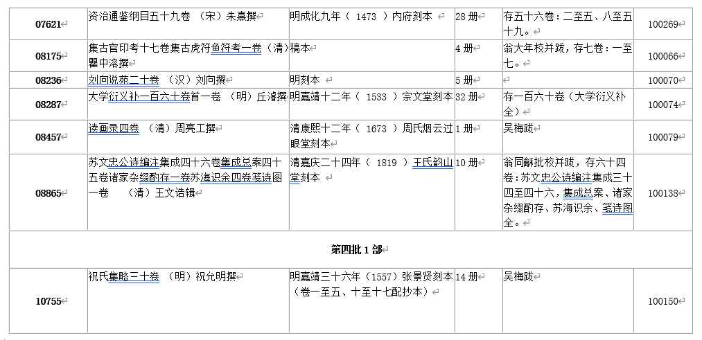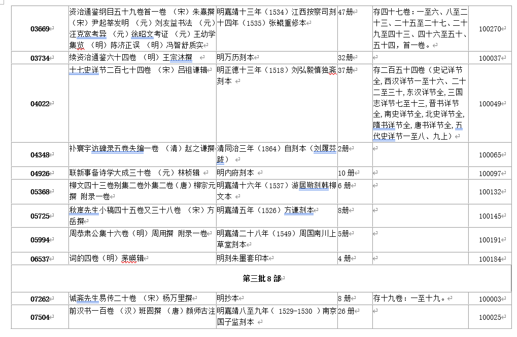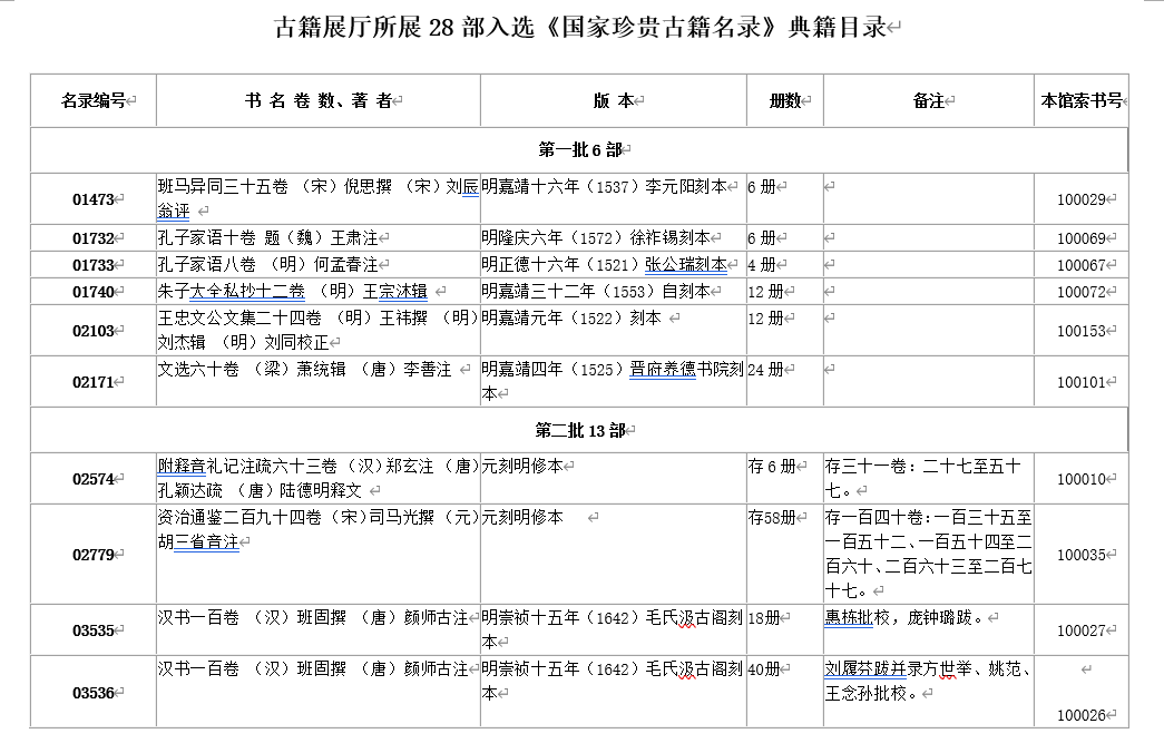 古籍展厅所展28部入选《国际珍贵古籍名录》典籍目录