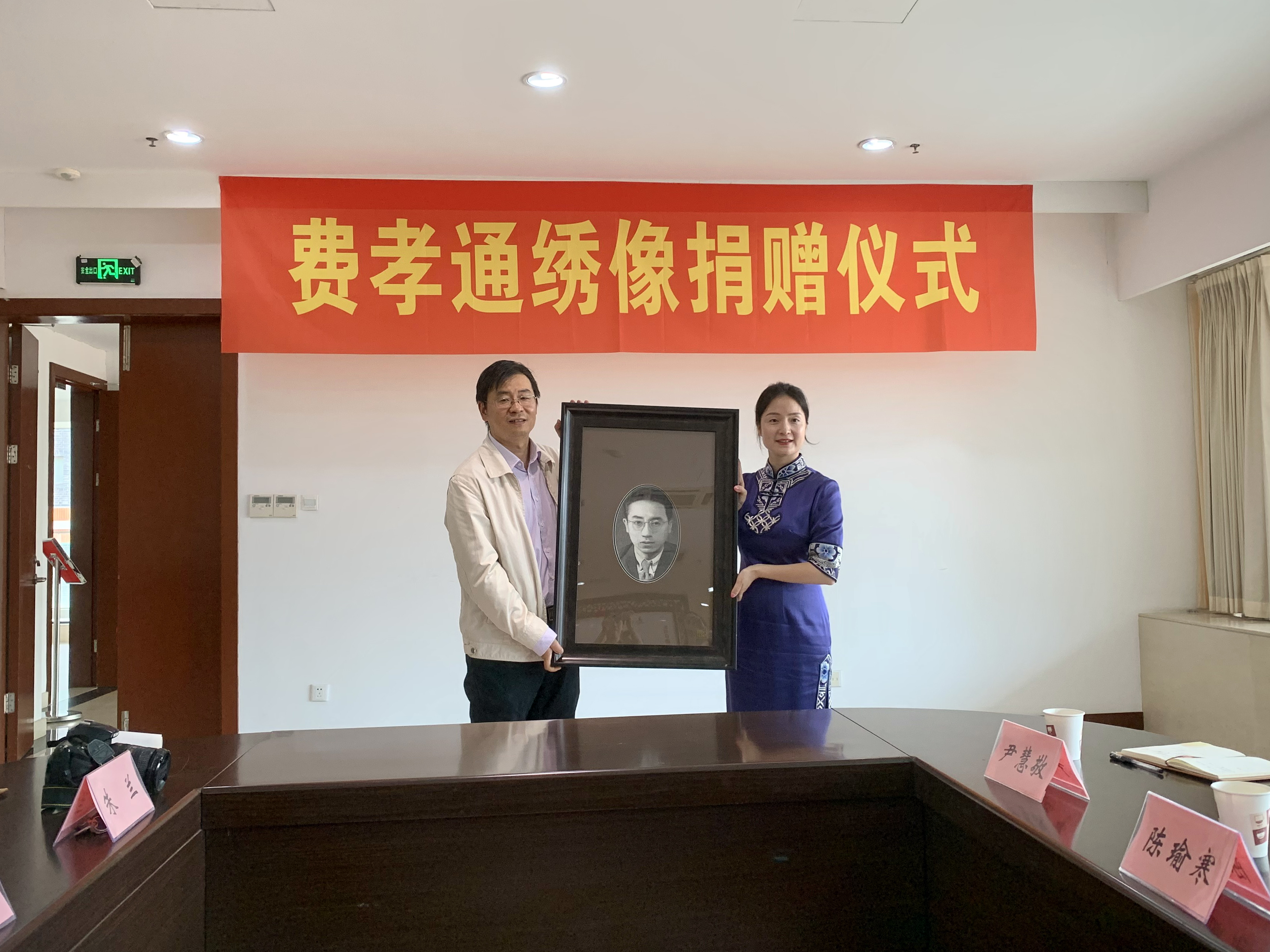 捐赠仪式上,王欣代表学校接受了绣像捐赠,冯一代表博物馆为刘昭艳女士颁发了捐赠证书。仪式结束后,刘昭艳女士一行参观了博物馆“费孝通纪念专区”,并敬献纪念鲜花。