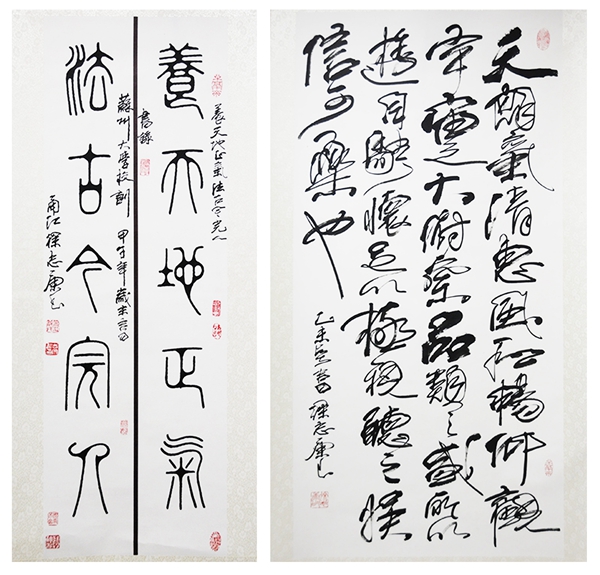 法古今完人”为创作蓝本,其篆书笔画圆润苍劲,雄浑遒丽,通篇尽显大气磅礴之感。行书《兰亭摘句》是徐志康先生摘自王羲之的《兰亭集序》中的一段佳句,整幅作品疏密得体,浓淡相宜,如行云流水一般洒脱飘逸。两幅作品均具有较高的收藏价值。